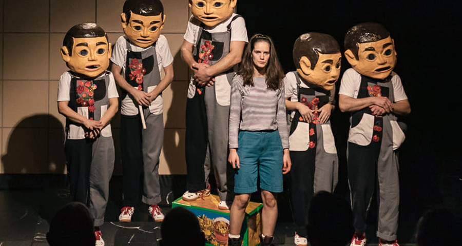 Pe măsură ce vinovăția se acumulează în mintea fetei – prin insomnii, certuri cu tatăl (Cătălin Mareș), relația distantă dintre părinți – spectacolul construiește un comentariu lucid asupra fragilității familiale. Convenția spitalului e marcată de apariția recurentă a Omului cu ghips, un personaj aproape absurd, simbol al suferinței colective și al incompetenței staff-ului medical. Printre aceștia, personajul Mamei (Alina Negrău) reprezintă un reminder al neglijenței față de Fiică, în timp ce corul de „măști Petru” devine vocea conștiinței fetei, între halucinație și auto-tortură. În spectacol apar momente de un grotesc satiric – precum scena mitei din spital, în care Moș Crăciun (Mască Petru) coboară sacul plin cu bani și cadouri peste zid– și altele de o violență emoțională, cum e secvența bullyingului, în care colegii fratelui cântă versuri ce stigmatizează victima. Fata încearcă să riposteze tuturor răutăților, aproape în van: „Așa pățesc copiii neatenți, obraznici, nedisciplinați” – pare sa fie cântecul-motto care îi va răsuna mult timp în cap. Între aceste două registre, regia lui Tudor Dreve menține un echilibru între realism și absurd.